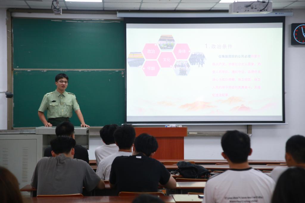 活动伊始,一段热血澎湃的视频拉开了活动的序幕。视频中,军人们的英勇事迹和家国情怀深深感染了在场的每一位同学。随后,洪一帆和黄少栋结合自身经历,从参军意义、体检政审标准、报名流程、优惠政策等方面进行了详细讲解,激发了同学们的参军热情。